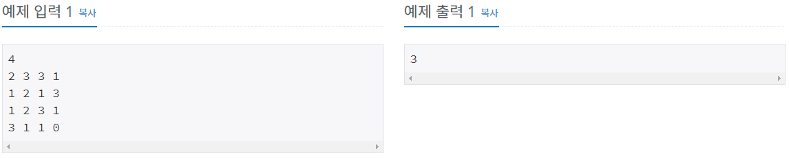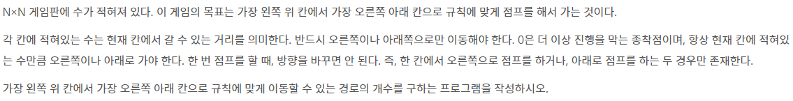 BufferedReader br = new BufferedReader(new InputStreamReader(System.in)); BufferedWriter bw = new BufferedWriter(new OutputStreamWriter(System.out)); StringTokenizer stringTokenizer; int num = Integer.parseInt(br.readLine()); long[][] dp = new long[num+1][num+1]; dp[1][1] = 1; for(int i=1; i<=num; i++){ stringTokenizer = new StringTokenizer(br.readLine()); for(int j=1; j<=num; j++){ int moveLength = Integer.parseInt(stringTokenizer.nextToken()); if(dp[i][j] >= 1 && moveLength != 0) { if (j + moveLength <= num) dp[i][j + moveLength] += dp[i][j]; if (i + moveLength <= num) dp[i + moveLength][j] += dp[i][j]; } } } bw.write(dp[num][num] + "\n"); bw.flush();반응형'문제풀이 > 백준' 카테고리의 다른 글