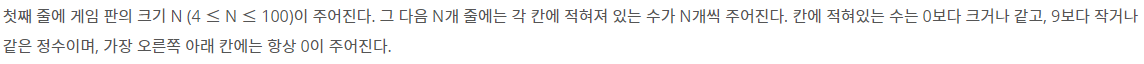 예제를 통해 문제를 풀면 맨 처음 움직일 수 있는 (1, 1)(가장 왼쪽의 가장 위쪽)은 어떤 게임이 되어도 1이 되어야 합니다.