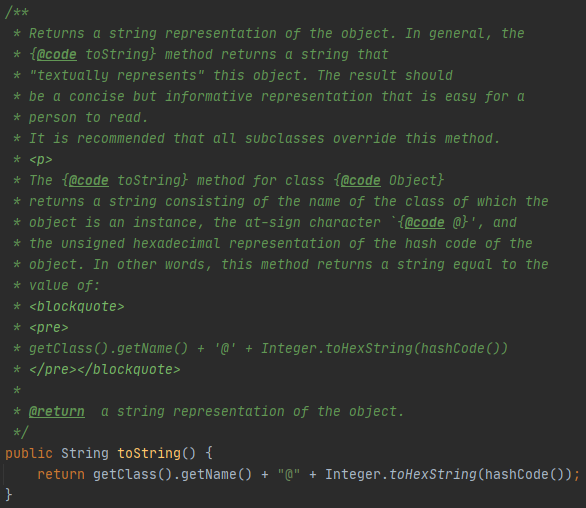toString 메소드는 Object 클래스에 정의되어 있는 메소드로 모든 Class는 toString 메소드를 정의되어 있습니다.