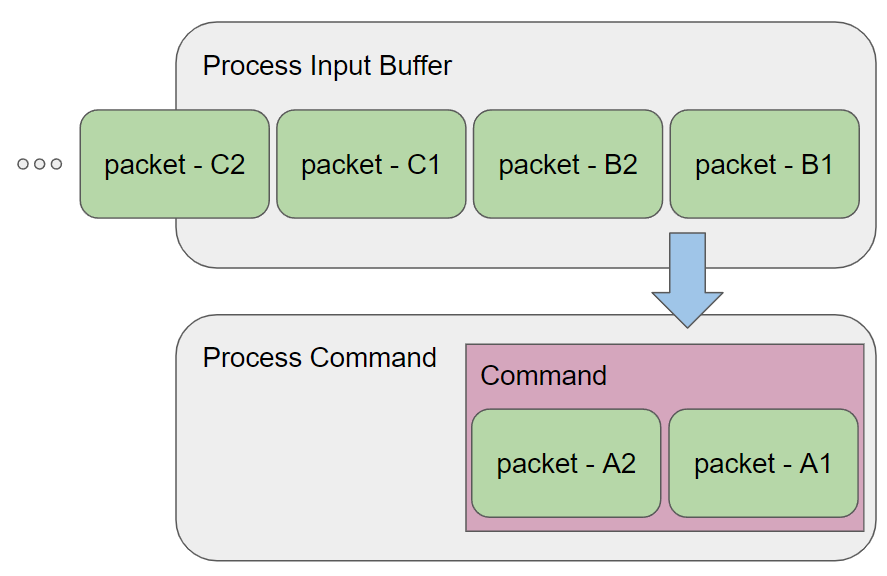 TCP 통신의 경우 Packet 단위로 데이터가 전송 되므로 Process Input Buffer에는 전송된 Packet들이 모이게 되고 모인 Packet을 조합하여 처리하고자 하는 데이터가 완성되면 Packet들을 조합하여 Command로 변경을 합니다.