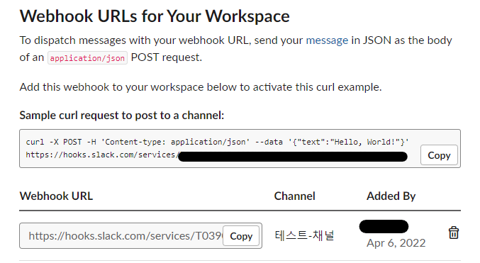 채널과의 연동이 완료되면 신규로 생성된 Webhook의 URL 정보와 함께 curl을 통한 Message전달 방법 예제가 만들어집니다.