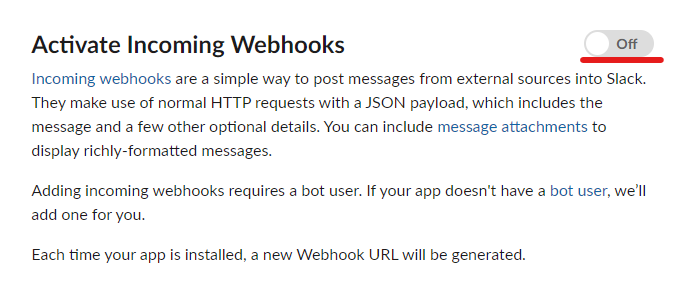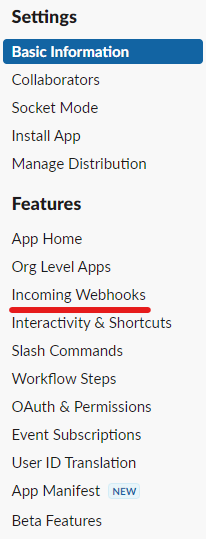 App 생성이 완료가 되었다면 좌측 Menu에서 Incoming Webhooks 메뉴 화면으로 이동합니다.