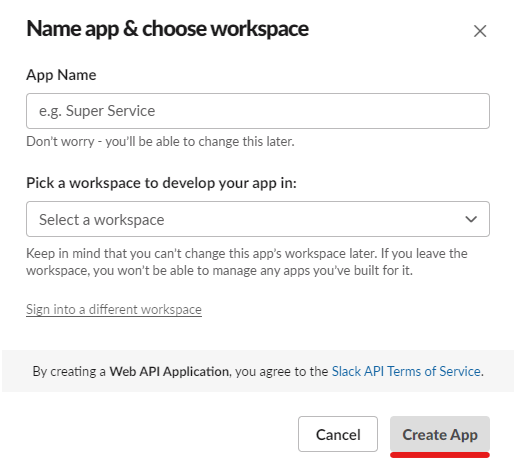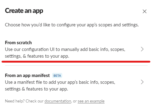 Modal창에서는 From scratch를 클릭하여 App 생성을 진행합니다. 다음 Modal 창에서는 App의 이름과 Slack의 workspace를 선택합니다. 모두 작성이 완료되었다면 우측 하단의 Create App을 클릭합니다.