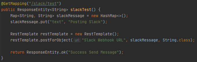 postForObject의 첫번째 파라미터는 Slack으로 부터 받은 Webhook URL을 작성하여 주면 되며 두번째 파라미터로는 Message가 될 정보를 전달해야 되므로 Map으로 필요한 정보를 담아 전달 하였습니다.