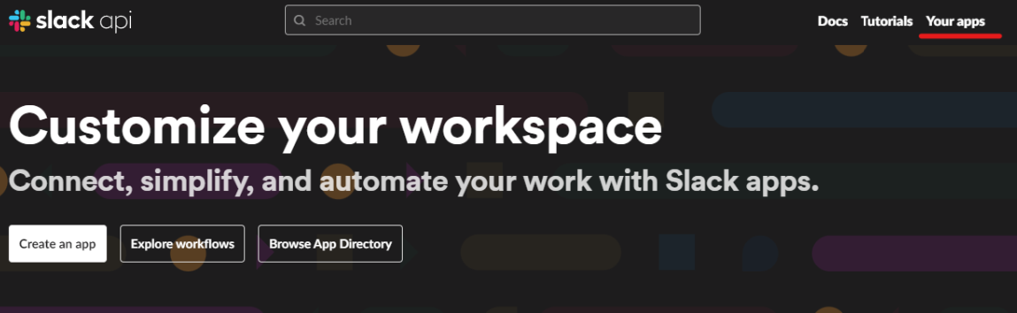 Slack Api 홈페이지에 접속합니다. 우측 상단의 Your App을 클릭하여 App 화면으로 진입합니다.