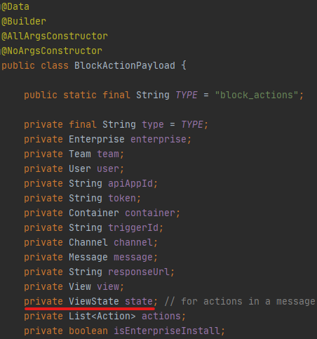public BlockActionPayload getPayload(String payloadJson){ return GsonFactory.createSnakeCase().fromJson(payloadJson, BlockActionPayload.class); }BlockActionPayload객체에 Input, TextArea 값들은 ViewState 객체의 values 속성에 담겨있습니다. 그러므로 해당 속성에 접근하여 가져와야 합니다.