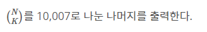 BufferedReader br = new BufferedReader(new InputStreamReader(System.in)); BufferedWriter bw = new BufferedWriter(new OutputStreamWriter(System.out)); StringTokenizer strToken; strToken = new StringTokenizer(br.readLine()); int n = Integer.parseInt(strToken.nextToken()); int k = Integer.parseInt(strToken.nextToken()); long[][] dp = new long[n+1][1001]; for(int i=0; i<=n; i++){ for(int j=0; j<=i; j++){ if(j == 0) dp[i][j] = 1; else dp[i][j] = (dp[i-1][j-1] + dp[i-1][j]) % 10007; } } bw.write(dp[n][k] % 10007 + "\n"); bw.flush();반응형'문제풀이 > 백준' 카테고리의 다른 글