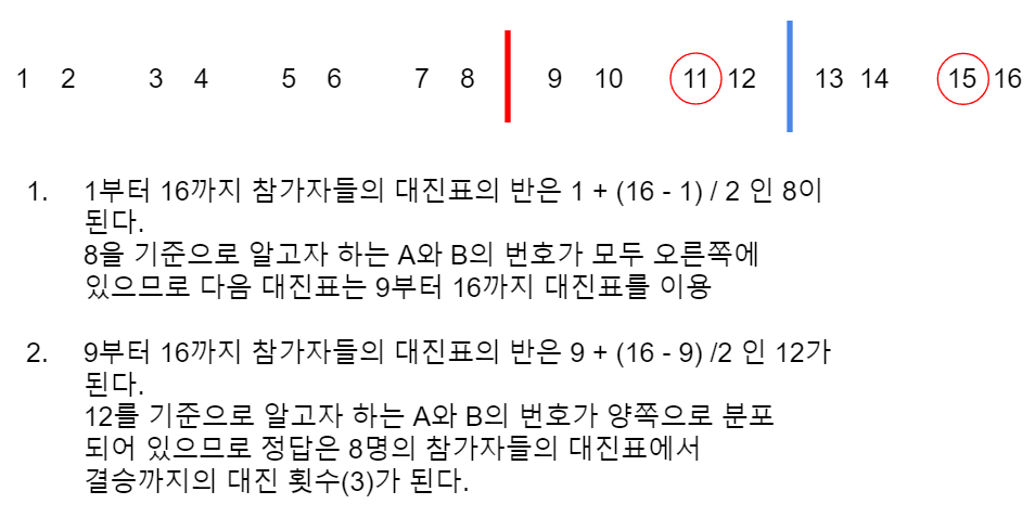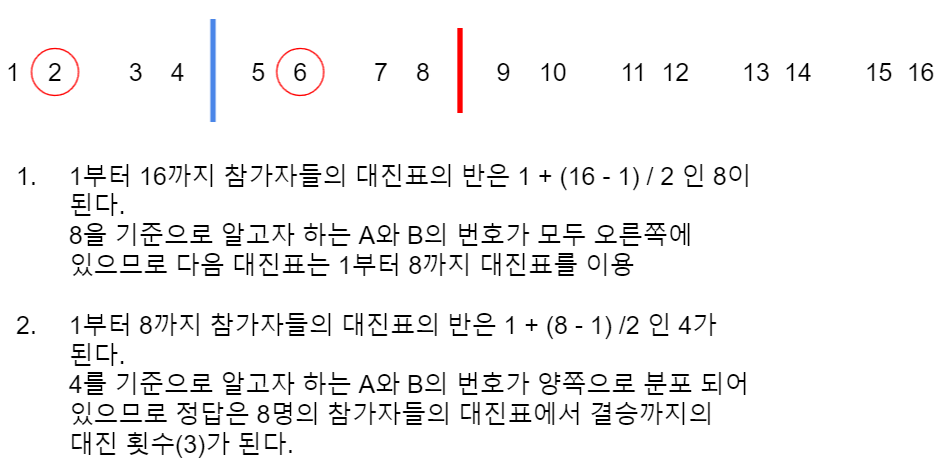 총 대진표를 기준으로 가운데 수에 해당하는 수를 찾아 오른쪽에 분포하는지 왼쪽에 분포하는지에 따라 시작과 끝을 조절하여 최종적으로 가운데 수를 기준으로 양쪽에 분포할 때까지 반복하여 문제를 풀었습니다.