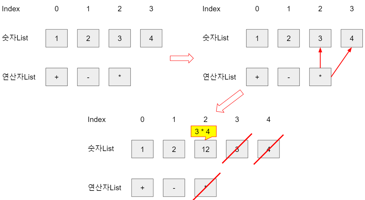 숫자List는 항상 연산자List보다 1개 더 많은 Element를 가지고 있으므로 연산자 Index에 해당 하는 수와 Index + 1에 해당하는 수를 해당 연산자로 계산한 경우 우선순위 순서대로 계산하는 것과 같은 효과를 보여 줍니다.