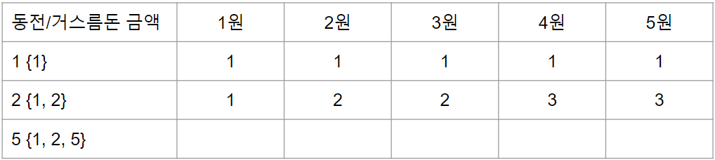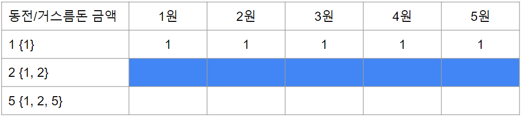 위 표의 두번째 줄(파란색 행)은 해당 행은 해당 동전보다 금액이 적은 경우와 큰 경우 2가지로 나누어집니다.