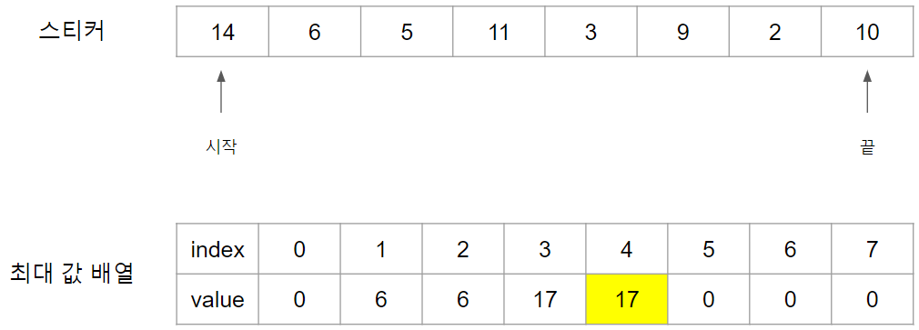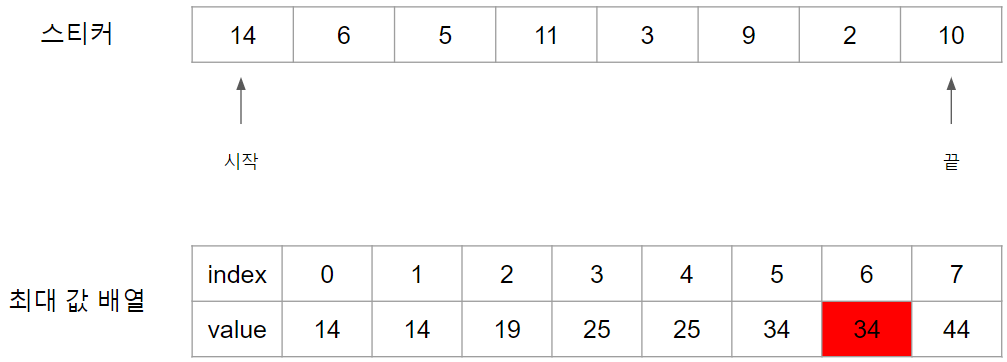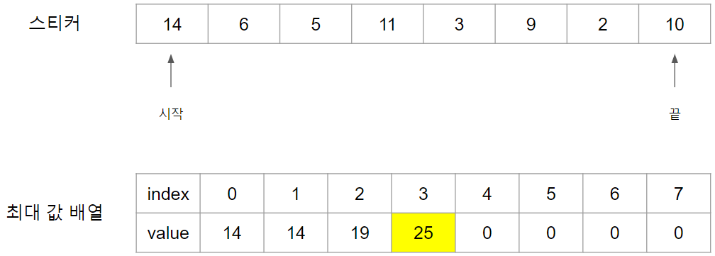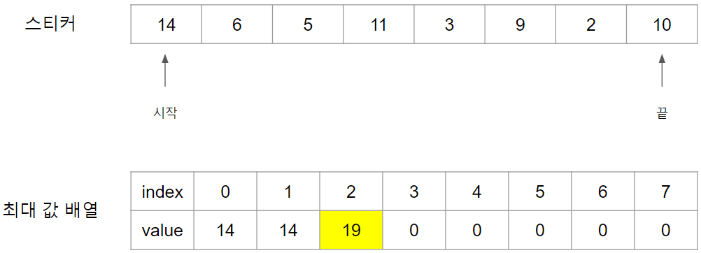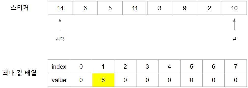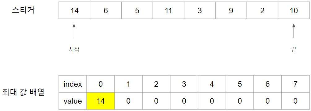 첫 스티커인 14번 스티커를 때면 최대 값 배열에 14를 Index 0번에 넣습니다.