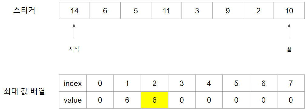 2번째 스티커인 6의 경우 14번의 스티커를 사용하였으므로 6번은 사용할 수 없습니다. 하여 이전 스티커 값인 14를 Index 1번에 넣습니다.