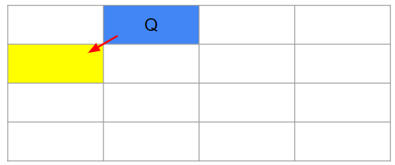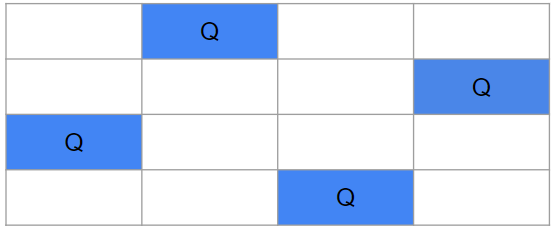 예를 들어서 n이 4인 경우 다음과 같이 퀸을 배치하면 n개의 퀸은 서로를 한 번에 공격할 수 없습니다.