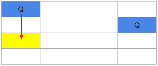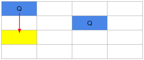 2번째 행에 놓인 퀸에 의해서 해당 위치의 퀸은 놓을 수 없으므로 다음 열로 이동하여 확인을 진행합니다.