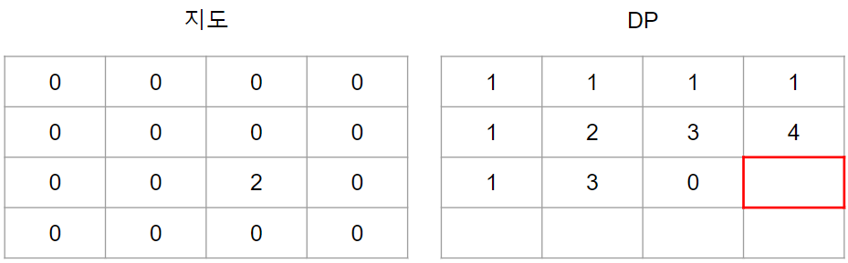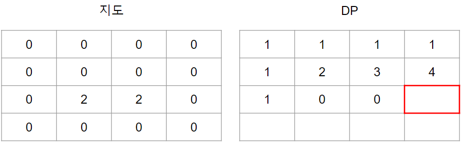 1인 경우는 지나갈 수 없는 길이기 때문에 해당 값은 점화식을 이용하지 않고 무조건 0의 값이 됩니다.