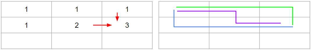 - 파란색 선인 (0,0) -> (0,1) -> (1,1) -> (2,1) 순으로 이동하여 (2,1)로 가는 방법