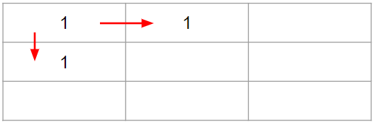(0,0)에서 (1,0)으로 가는 방법은 1가지 이므로 (1,0)의 값은 1이 됩니다.