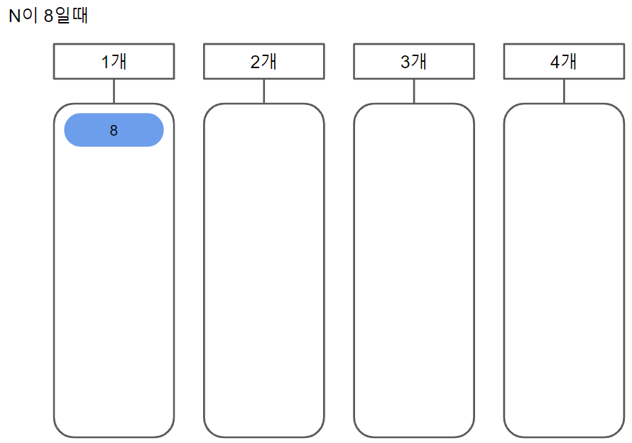 이제 만들어진 1 ~ 8까지 개수를 가지고 있는 통에서 찾는 수가 있는 최소의 통을 찾아 해당 통에 적혀 있는 개수를 반환하면 문제를 풀 수 있습니다.