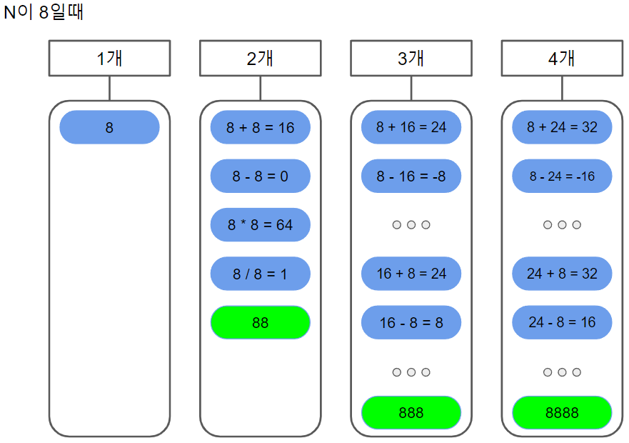 자 그럼 N숫자 2개로 만들 수 있는 숫자는 1개로 만든 숫자 (+, -, *, /) 1개로 만든 숫자가 될 것입니다.