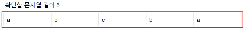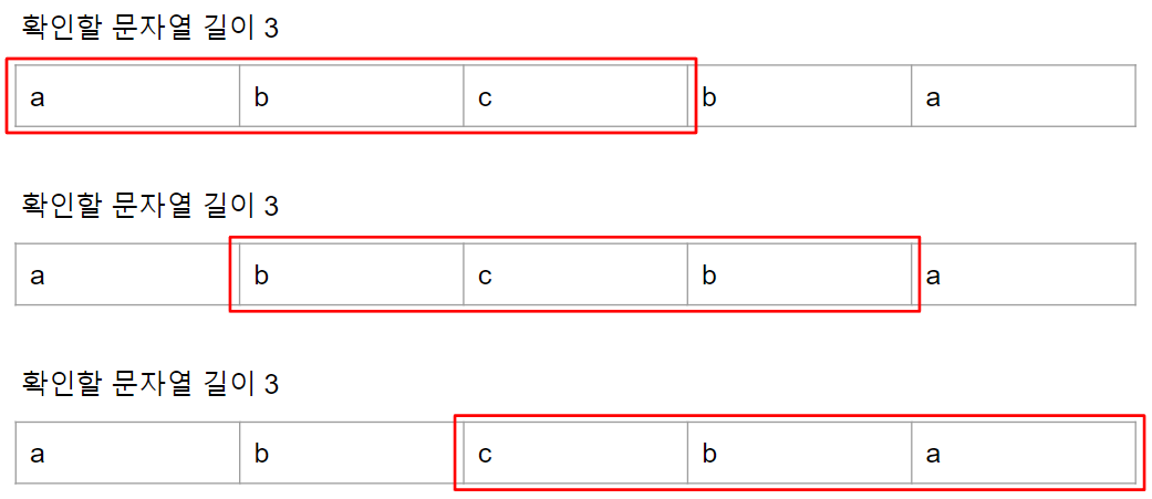 맨 처음에는 가장 긴 문자열인 입력 문자열 그대로를 팰린트롬 확인을 진행합니다.
