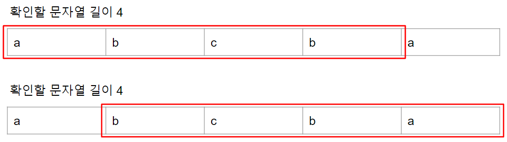 만약 4개의 문자열을 확인한 결과 2가지 경우 모두 팰린트롬이 아니라면 3개의 문자열을 확인합니다.