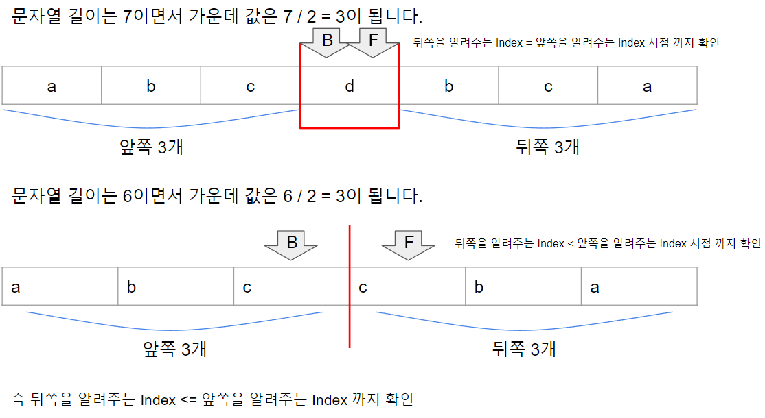 이때 문자열의 길이가 짝수와 홀수가 서로 다르다고 생각할 수 있습니다. 하지만 가운데 위치까지 문자열을 비교하는 횟수는 짝수, 홀수 모두 동일하기에 상관이 없습니다.
