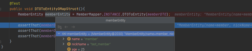 MemberDTO를 MemberEntity로 변환 결과 MemberEntity 속성 결과