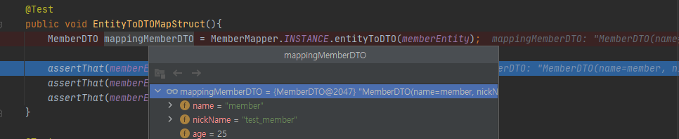 MemberEntity를 MemberDTO로 변환 결과 MemberDTO속성 결과