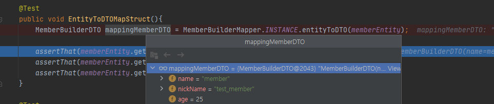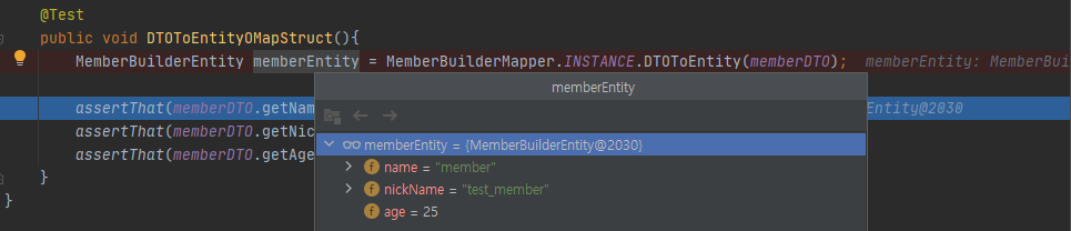 MemberBuilderDTO를 MemberBuilderEntity로 변환 결과 MemberBuilderEntity속성 결과