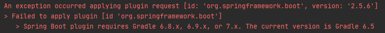 Error 내용을 보면 알 수 있지만 Spring Boot plugin을 사용하기 위해서는 Gradle의 버전이 6.8.x, 6.9.x, 또는 7.x 이상이어야 한다고 한다.