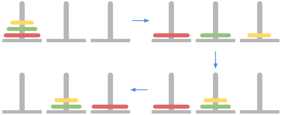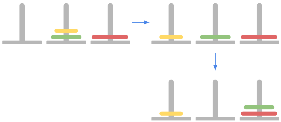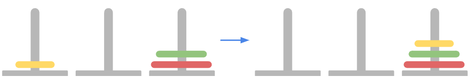 여기서 가장큰 빨간링을 1번 막대에서 3번 막대로 옮기기 위해서 노란링과 초록링을 2번으로 옮기는 작업이 필요하며 이 과정에서 3번 막대를 임시로 사용하는 과정이 있습니다.