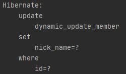 DynamicUpdate 어노테이션을 적용한 Entity의 Update 쿼리를 보면 변경한 nickName 필드만 Update 쿼리로 생성된 것을 볼 수 있습니다.