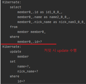 이후 Transaction이 종료 되므로 Commit과 동시에 쓰기지연 SQL 저장소에 있던 Update 쿼리를 DB에 실행하여 NickName을 변경 합니다.