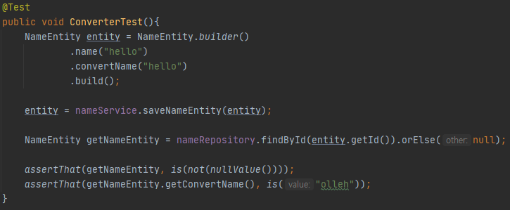 먼저 name속성과 convertName속성에 'hello' 값을 입력한 NameEntity를 하나 생성하고 DB에 해당 Entity를 저장합니다.