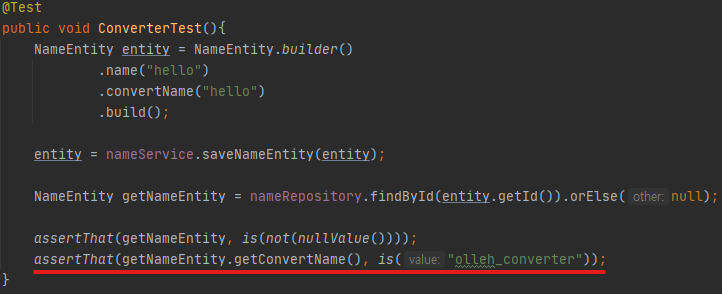 이후 DB로부터 위에서 저장한 Entity를 조회하여 Entity의 convertName의 값을 확인합니다.