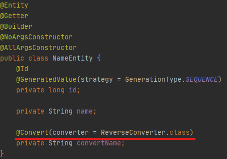 NameEntity는 id, name, convertName 속성 3개를 가지고 있는 Entity로 구성되어 있으며 convertName은 @Convert어노테이션을 사용하여 해당 속성이 사용할 AttributeConverter Class를 지정하였습니다.