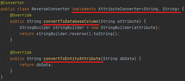 convertToDatabaseColumn는 DB에 저장하기 전 속성에 입력된 문자열을 반대로 뒤집어 저장하도록 구현하였으며