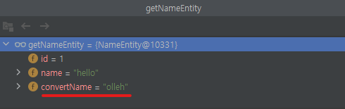 디버깅을 통해 조회한 Entity getNameEntity의 상태 값을 확인한 결과 convertName의 값이 'olleh'로 입력된 것을 확인할 수 있습니다.
