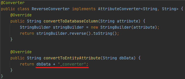 이번에는 convertToEntityAttribute 메소드를 수정하여 DB에서 조회한 문자열 뒤에 '_converter' 문자열을 추가하도록 변경하도록 하겠습니다.