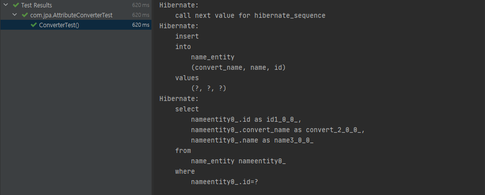 Test 결과 또한 성공이므로 조회된 Entity의 convertName 속성의 값이 'hello'가 아닌 'olleh'이 조회된 것을 확인할 수 있습니다.