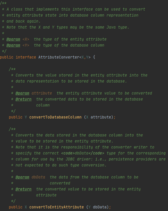 AttributeConverter 인터페이스의 경우 2개의 메소드만 정의되어 있는 아주 간단한 인터페이스입니다.