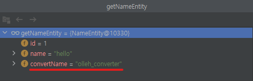디버깅을 통해 조회한 Entity getNameEntity의 상태 값을 확인한 결과 convertName의 값이 'olleh_converter'로 입력된 것을 확인할 수 있습니다.