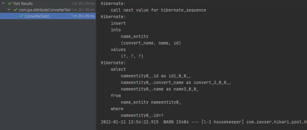 예상되는 결과는 생성된 Entity의 convertName의 속성 값을 hello로 입력한 뒤 저장 시 ReverseConverter의 convertToDatabaseColumn메소드에 의해 'hello'가 'olleh'로 변환되어 DB에 저장될 것입니다.