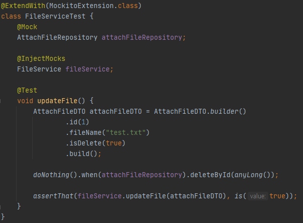 그럼 FileService의 deleteFile 메소드를 Mocking 하여 파일의 존재 여부와 상관없이 파일이 정상 제거된 것처럼 true를 반환하도록 하면 Test는 정상적으로 진행될 것 같습니다.