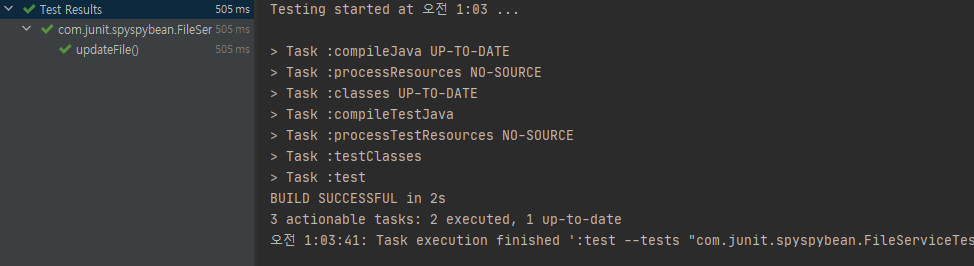 FileServiceTest 3 Test가 실패하던 코드에서 FileService에 @Spy 어노테이션만 추가 하여 Test를 진행 하도록 하겠습니다.