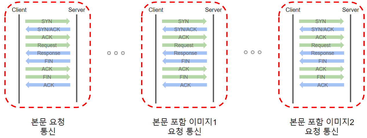 HTTP가 발전하면서 텍스트가 아닌 다수의 이미지가 포함된 문서들이 전달되고 이렇게 이미지가 포함된 문서를 출력하기 위해 브라우저는 이미지 요청을 이미지 수 만큼 다시 요청하는 등 통신의 횟수가 늘어나게 되었습니다.