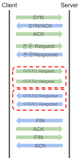 기존에는 요청을 하면 응답이 올때 까지 대기 후 응답을 받은 뒤 다음 요청을 전달 하였습니다. 그러나 지속적 연결이 가능해지고 파이프라인화가 되면서 요청을 하고 응답을 받지 않아도 다음 요청을 진행하는 것이 가능하게 되었습니다.