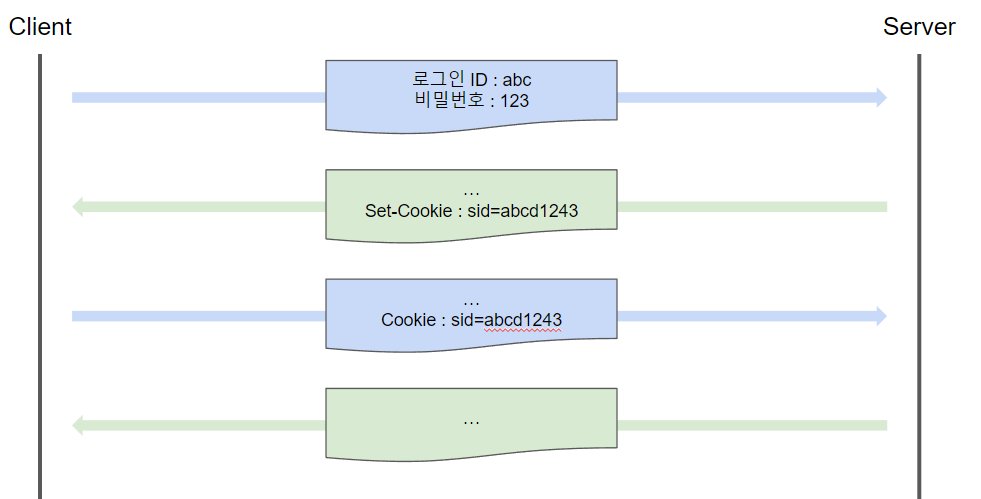 - 이후 클라이언트 요청에는 항상 Cookie 필드에 이전 Set-Cookie로 받은 값을 포함하여 서버로 요청을 전달
