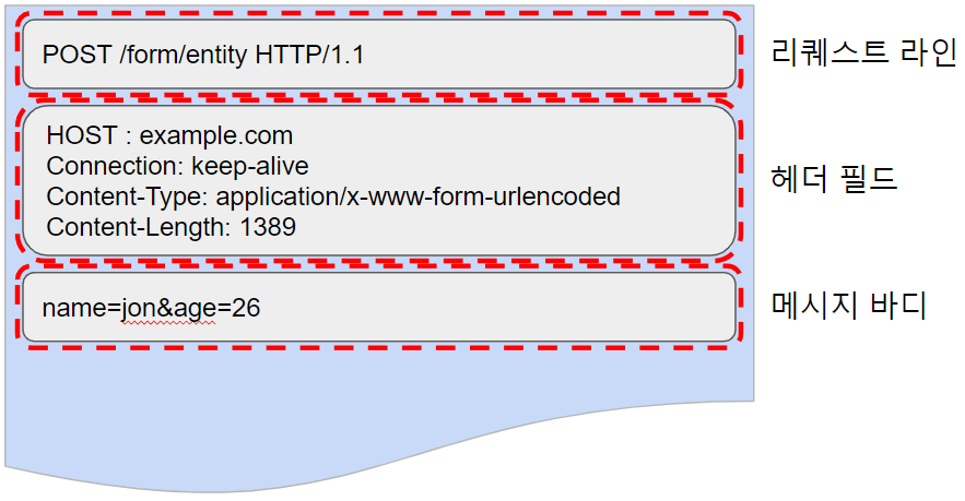리퀘스트 메시지는 리퀘스트 라인, 헤더 필드, 메시지 바디로 구성되어 있습니다.