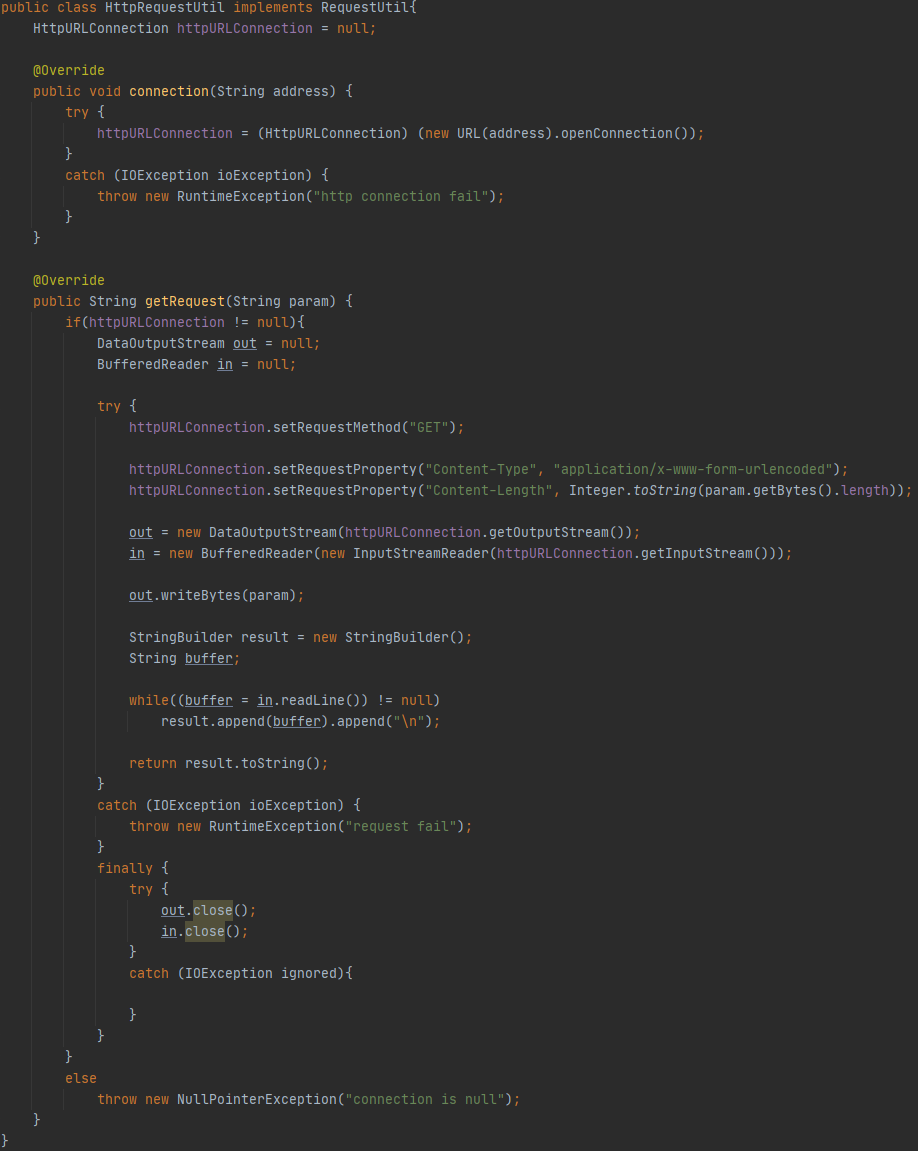 Mock의 경우 HttpRequestUtil의 껍데기만 가지고 있는 객체이므로 connect메소드나 getRequest메소드가 정의되어 있지 않습니다.